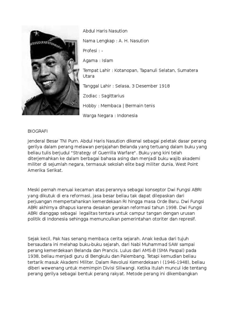 Jakarta 6 September 2000 Agama. Abdul haris nasution Abdul Haris Nasution lahir pada tanggal 3 Desember 1918 di Huta Pungut kota Nopan Tapanuli Selatan. Biografi Abdul Haris Nasution dikenal sebagai peletak dasar perang gerilya dalam perang melawan penjajahan Belanda yang tertuang dalam buku yang beliau tulis berjudul Strategy of Guerrilla Warfare.