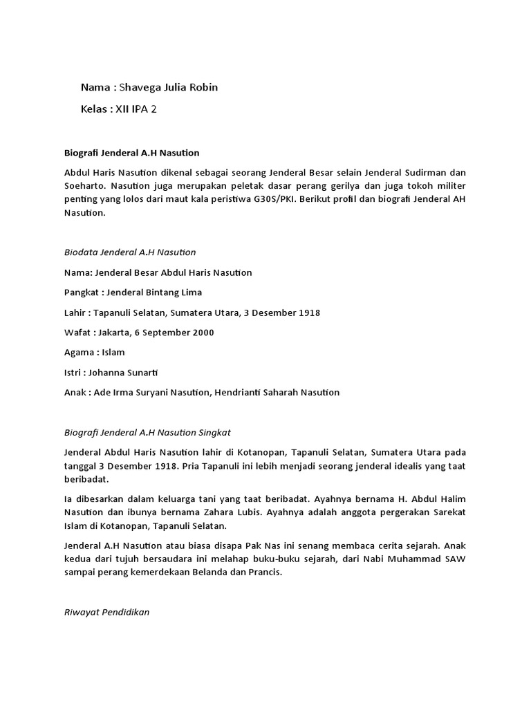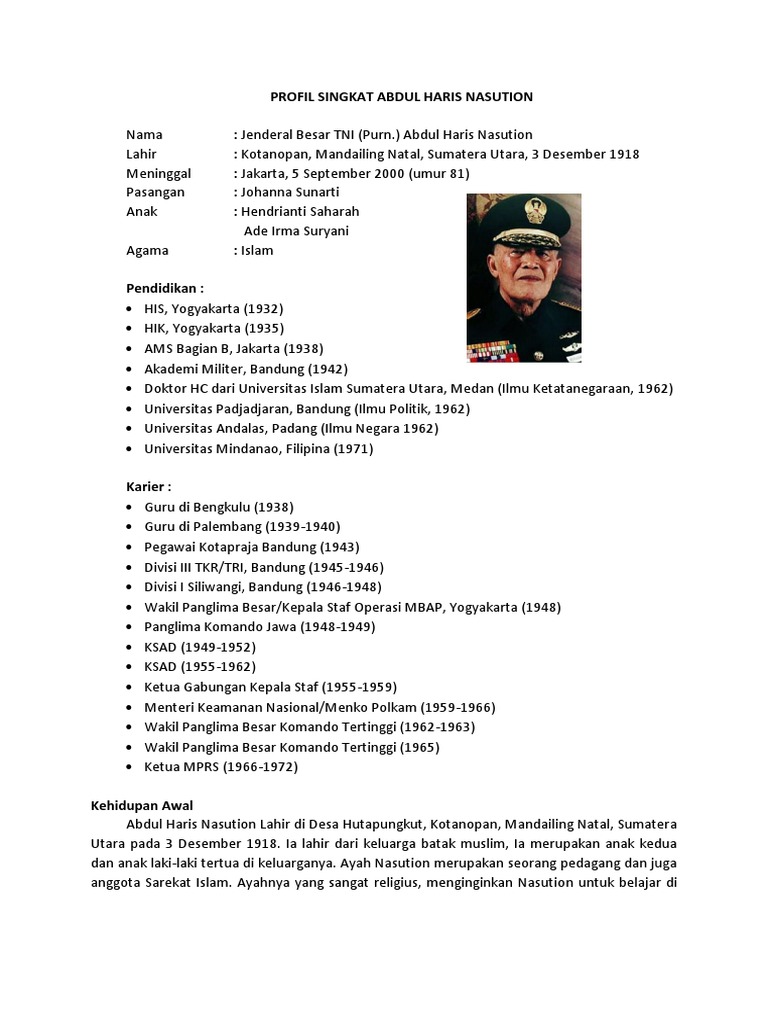 Biografi abdul haris nasution singkat. Abdul Haris Nasution dilahirkan pada tanggal 3 Desember 1918 di Huta Pungkut Kecamatan Kotanopan Tapanuli Selatan sebagai putera kedua H. Jenderal Besar Abdul Haris Nasution Pangkat Jenderal Bintang Lima Lahir Tapanuli Selatan Sumatera Utara 3 Desember 1918 Wafat Jakarta 6 September 2000 Agama Islam Istri Johanna Sunarti Anak Ade Irma Suryani. Biografi Abdul Haris Nasution Abdul Haris Nasution lahir pada tanggal 3 Desember 1918 di Huta Pungut kota Nopan Tapanuli Selatan.