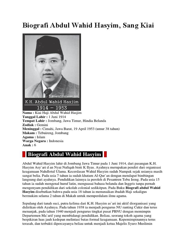 Kiai Haji Abdul Wahid Hasjim adalah pahlawan nasional Indonesia dan menteri negara dalam kabinet pertama Indonesia yang lahir di Jombang Jawa Timur 1 Juni 1914 Jumat Legi 5 Rabiul Awal 1333 Hijriyah. Hasyim Zaini merupakan putra pertama dari Almarhum KH. Tugas Sejarah Indonesia Alexandro Nesta Kelas XII MIPA 3.