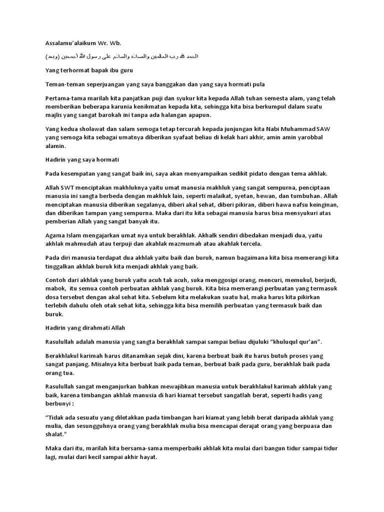 Contoh pidato agama islam tentang akhlak terbaru pidato adalah salah satu aspek dari kegiatan berbahasa yakni berbicara yang dilakukan di depan khalayak ramai dengan tujuan penyampaian ide pendapat serta gagasan tertentu. Naskah pidato bahasa arab akhlak terpuji Last Update. Manusia bisa berperilaku baik dan berperilaku buruk sesuai dengan kehendak hati dan godaan.