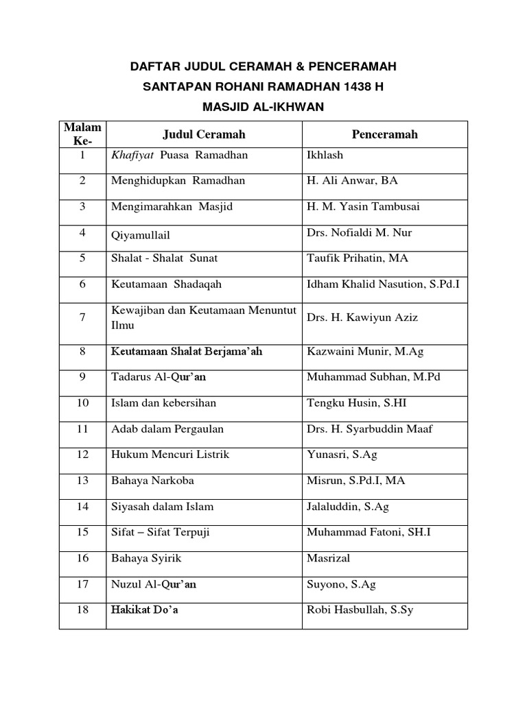 Judul ceramah ramadhan yang pertama adalah hukum solat tarawih. Daftar Judul atau Tema Ceramah Tarawih dan Bada Subuh Bulan Ramadhan. Selain untuk ceramah tarawih bisa pula untuk kuliah Subuh atau bacaan harian secara pribadi.