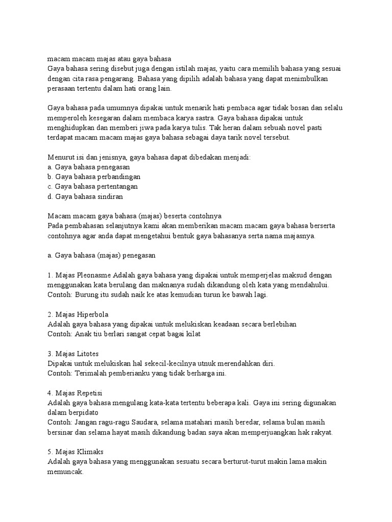 Majas adalah gaya bahasa yang digunakan penulis untuk menyampaikan sebuah pesan secara imajinatif dan kias. Asal Mula Bahasa Indonesia dan Perkembangannya hingga Kini Bahasa Indonesia diresmikan menjadi bahasa persatuan dan bahasa untuk pergaulan sehari-hari di Indonesia sejak dibacakannya tiga keputusan dari Kongres Sumpah Pemuda II. Bukan hanya Bahasa Inggris yang memiliki tata bahasa atau grammar tapi Bahasa Indonesia juga punya aturan mainnya.