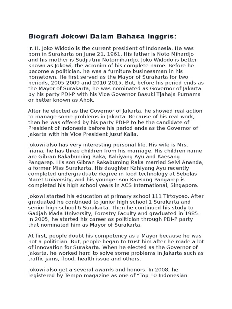 Joko Widodo was born in Surakarta 9 June 1961 better known by the nickname Jokowi is a businessman and furniture he was Mayor of Surakarta Solo for two times the service 2005- 2015. Jusuf Kalla was born with the full name Muhammad Jusuf Kalla. Written Trend Contoh Recount Text dan Biografi Jokowi Dalam Bahasa Inggris Lengkap Dengan Terjemahan dan Pembahasan Materi By Pustaka Bahasa Inggris Posted on January 4 2019 39 5 16 votes Dear Writer Siapa yang tidak kenal dengan Bapak Presiden kita yang satu ini.
