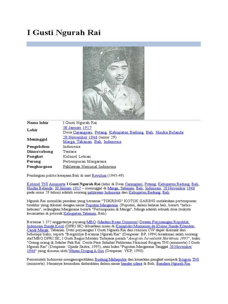 Lahir di Badung 30 Januari 1917 I Gusti Ngurah Rai merupakan anak dari seorang camat Petang I Gusti Ngurah Palung. I Gusti Ngurah Rai adalah pahlawan nasional asal Bali yang memimpin perang habis-habisan yaitu perang Puputan Margarana yang terjadi pada 20 November 1946. Kolonel TNI Anumerta I Gusti Ngurah Rai - Puputan Margarana Kolonel TNI Anumerta I Gusti Ngurah Rai lahir di Desa Carangsari Petang Kabupaten Badung Bali Hindia Belanda 30 Januari 1917 meninggal di Marga Tabanan Bali Indonesia 20 November 1946 pada umur 29 tahun adalah seorang pahlawan Indonesia dari Kabupaten Badung Bali.