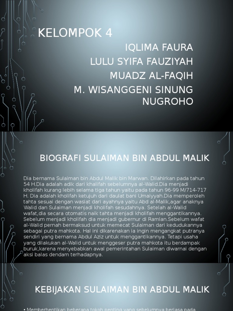 Di antara yang terkemuka i. Yazid bin Walid bin Abdulmalik atau Yazid III 701 - 744 ialah Khalifah Bani UmayyahIa naik tahta hanya selama 6 bulan sebelum meninggal. Biografi Sulaiman bin Abdul Malik Sulaiman bin Abdul Malik lahir pada Tahun 55 H bertepatan pada Tahun 674 Masehi di Masa Pemerintahan Khalifah Muawiyah bin Abu Sufyan.