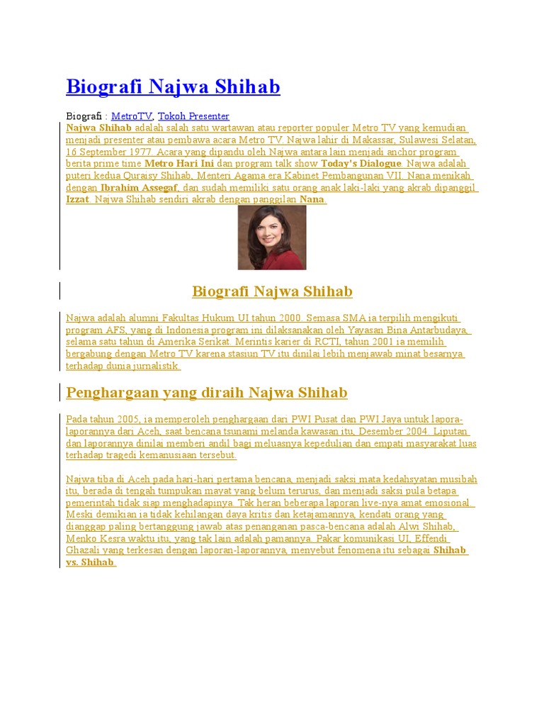 Semasa SMA ia terpilih mengikuti program AFS yang di Indonesia program ini dilaksanakan oleh Yayasan Bina Antarbudaya selama satu tahun di Amerika Serikat. Halo SobatPustakaNajwa Shihab dan buku ibarat dua hal yang tak terpisahkan. Najwa lahir di Ujungpandang Sulawesi Selatan 16 Séptember 1977.