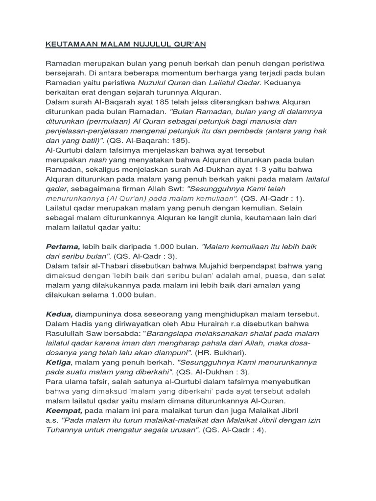 Sebagai sebuah malam istimewa umat Islam dianjurkan untuk mengisi malam Nuzulul Quran dengan beribadah. شهر رمضان الذي أنزل فيه القرآن هدى للناس وبينات من الهدى والفرقان. Menurut beliau Surat Al Baqarah ayat 185 Surat Ad Dukhan ayat 4 dan Al Qadr ayat 1 tersebut menerangkan tentang permulaan turunnya Al Quran.