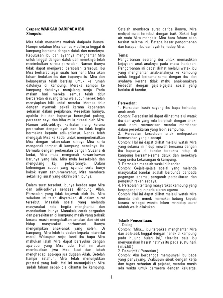Cerpen Warkah Daripada Ibu Sinopsis