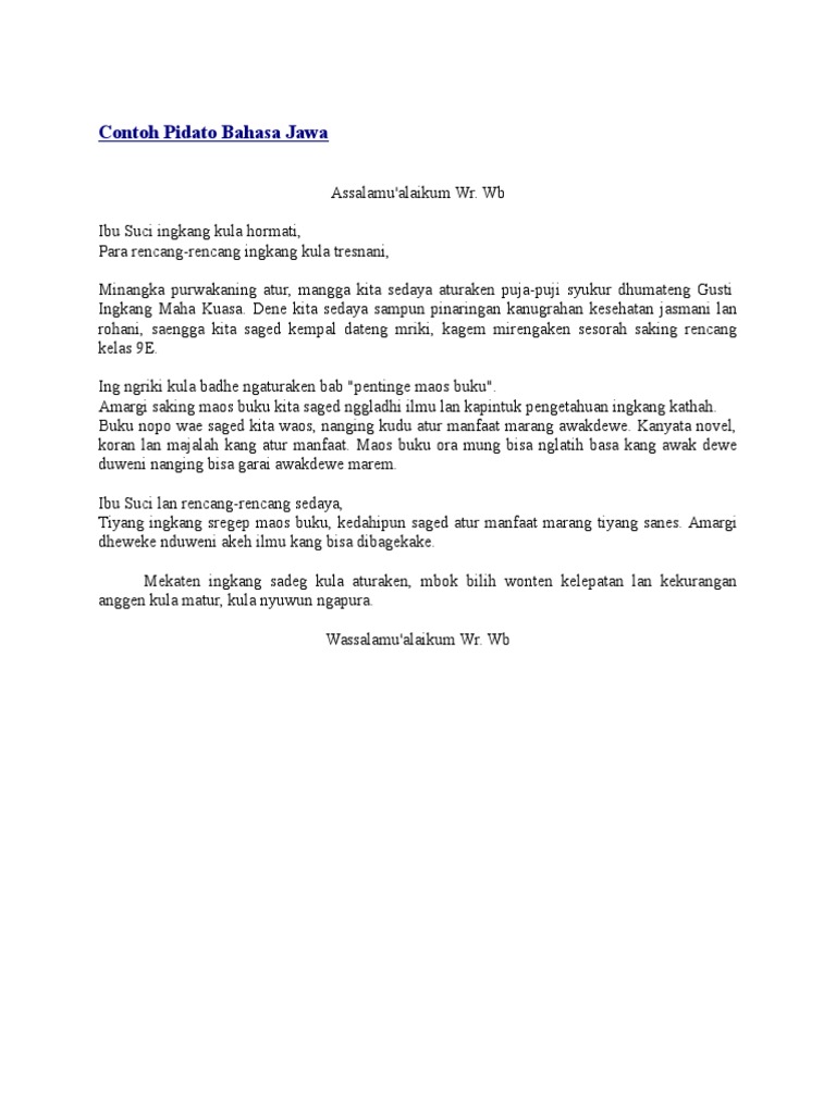 Pidato bahasa Jawa emang selalu kamu jumpai hampir di setiap even-even yang ada di Jawa tentunya. Contoh Pidato Bahasa Jawa Bertema Pendidikan. Karena daerah-daerah ini memiliki kesatuan bahasa yang sama.