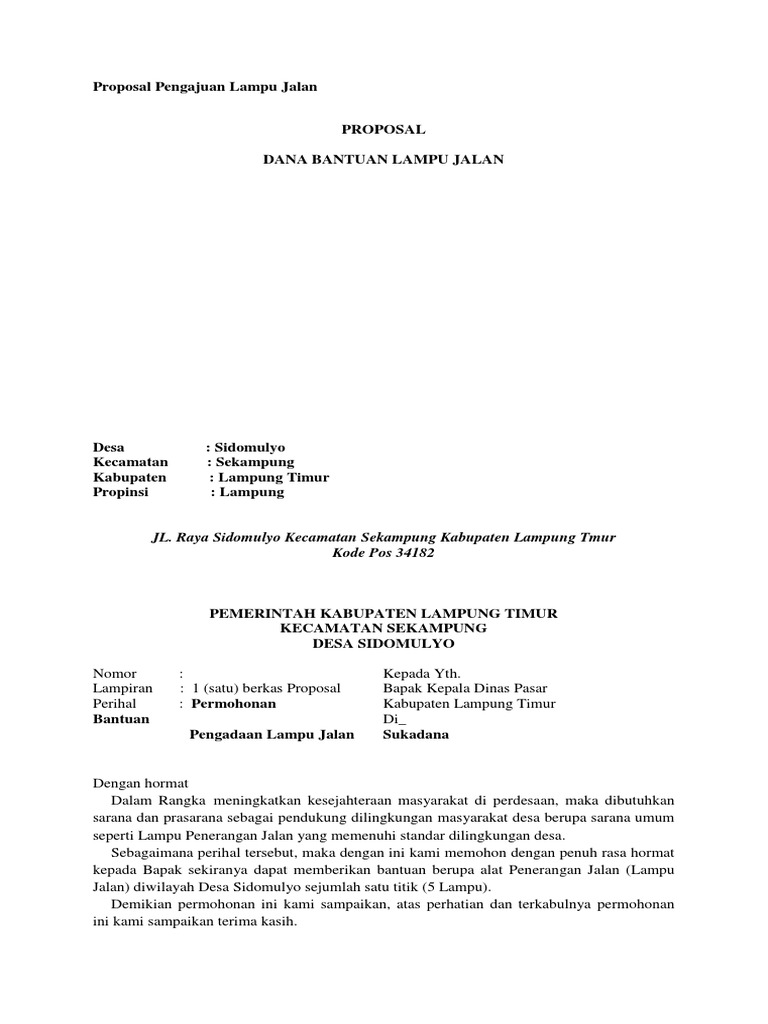Contoh Proposal Lampu Penerangan Jalan Desa Berbagi Contoh Proposal Jalan di lingkungan pondok pesantren miftahul huda 3 karena saat ini lampu penerangan jalan umum sudah tidak berfungsi sehingga aspek keamanan pun berkurang. Akhirnya tak lupa sekali semoga pihak yang terkait dalam hal ini dapat mengabulkan permohonan ini dan dapat mempertimbangkan usulan kegiatan dan memprioritaskan Pembangunan Desa Sidomulyo sebagai. 400 002 Ds2014 VII2018 Penting 1 satu berkas Proposal Permohonan hibah untuk Pengadaaan kendaraan operasional pelayanan kesehatan.