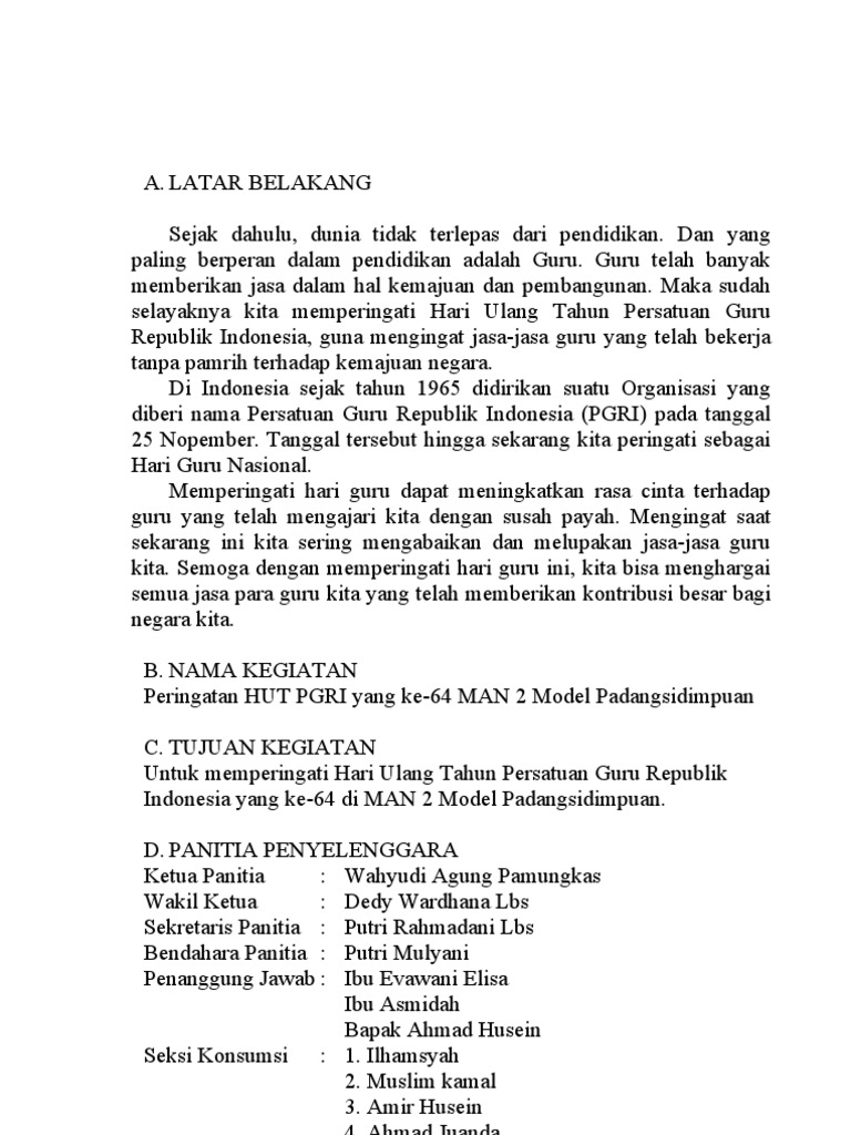 Hari Guru Nasional Tahun 2014 dan HUT PGRI ke 69 akan diperingati secara nasional. 2Mempererat tali silahturrahmi antara siswa dan guru SMA Negeri 10 Medan. Proposal Kegiatan the 1st Anniversary of Beleter Community Contoh Proposal Anniversary - Guru Ilmu Sosial Contoh Proposal Proposal RamadhanCinta2016 1437H Proposal HCST Chapter Depok Peduli Ramadhan 1434 H DOC Proposal Kegiatan Bakti Sosial Ari Mugsitho - Academiaedu Proposal 1 Proposal Kegiatan Bakti Sosial DOC CONTOH PROPOSAL KARANG TARUNA.