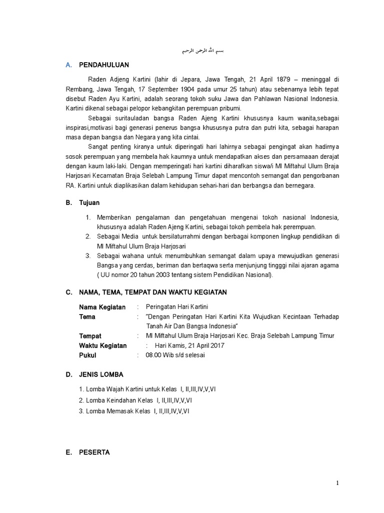 Sasaran BAB II PROGRAM DAN RENCANA KEGIATAN A. Demikian proposal kegiatan dalam memperingati Hari Kartini ini kami buat dengan harapan supaya seluruh pihak memiliki kesediaan untuk ikut mendukung serta berpartisipasi dengan agenda kami. PROPOSAL KEGIATAN LOMBA DALAM RANGKA MEMPERINGATI HARI KARTINI TAHUN 2014 ORGANISASI SISWA INTRA SEKOLAH OSIS SMA NEGERI 1 BERMANI ULU KABUPATEN REJANG Kepala Sekolah SMA N 1 BERMANI ULU Di Tempat Dengan hormat RA Kartini merupakan seorang pahlawan yang telah berkorban memperjuangkan hak dan derajat kaum wanita.