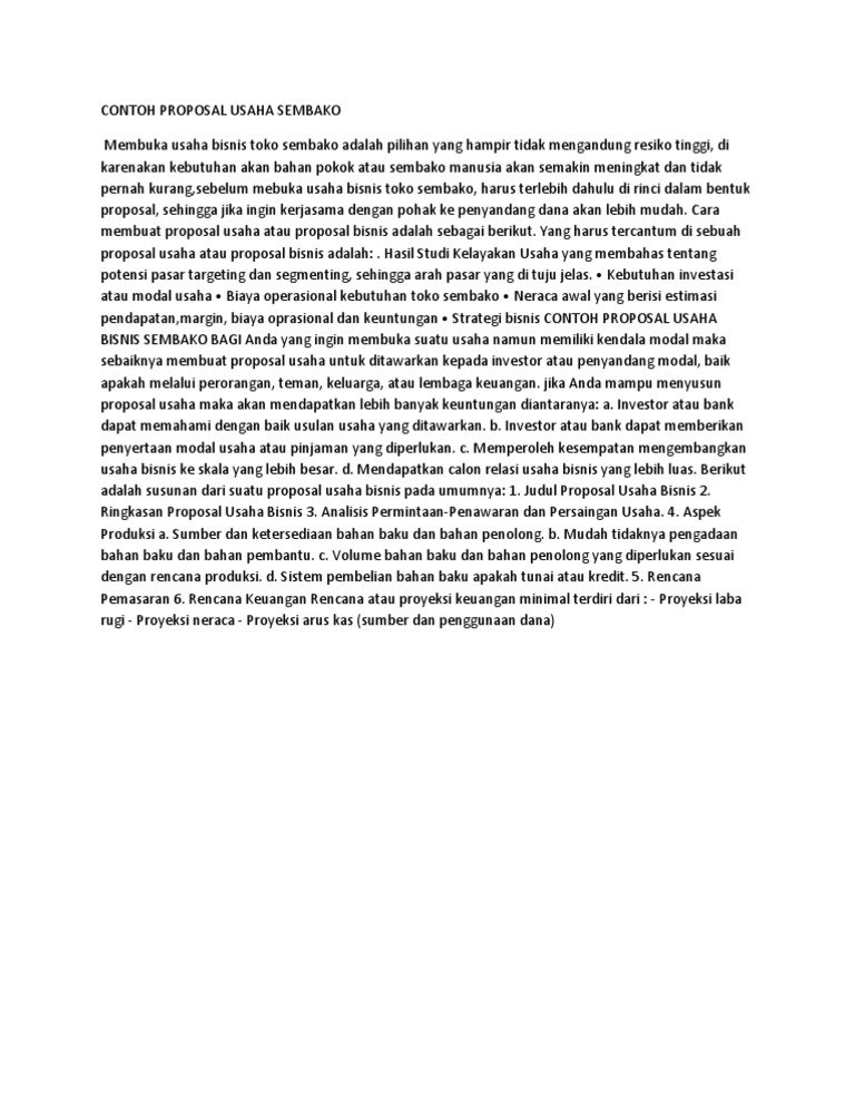 CONTOH PROPOSAL USAHA BISNIS SEMBAKO BAGI Anda yang ingin membuka suatu usaha namun memiliki kendala modal maka sebaiknya membuat proposal usaha untuk ditawarkan kepada investor atau penyandang modal pihak bank dan lembaga keuangan. Membuka usaha bisnis toko sembako adalah pilihan yang hampir tidak mengandung resiko tinggi di karenakan kebutuhan akan bahan pokok atau sembako manusia akan semakin meningkat dan tidak pernah kurangsebelum mebuka usaha bisnis toko sembako harus terlebih dahulu di rinci dalam bentuk proposal sehingga jika ingin kerjasama dengan pohak ke penyandang dana akan lebih mudah. Proposal Bakulandocx Call for Proposals 2020 - Indika Foundation.