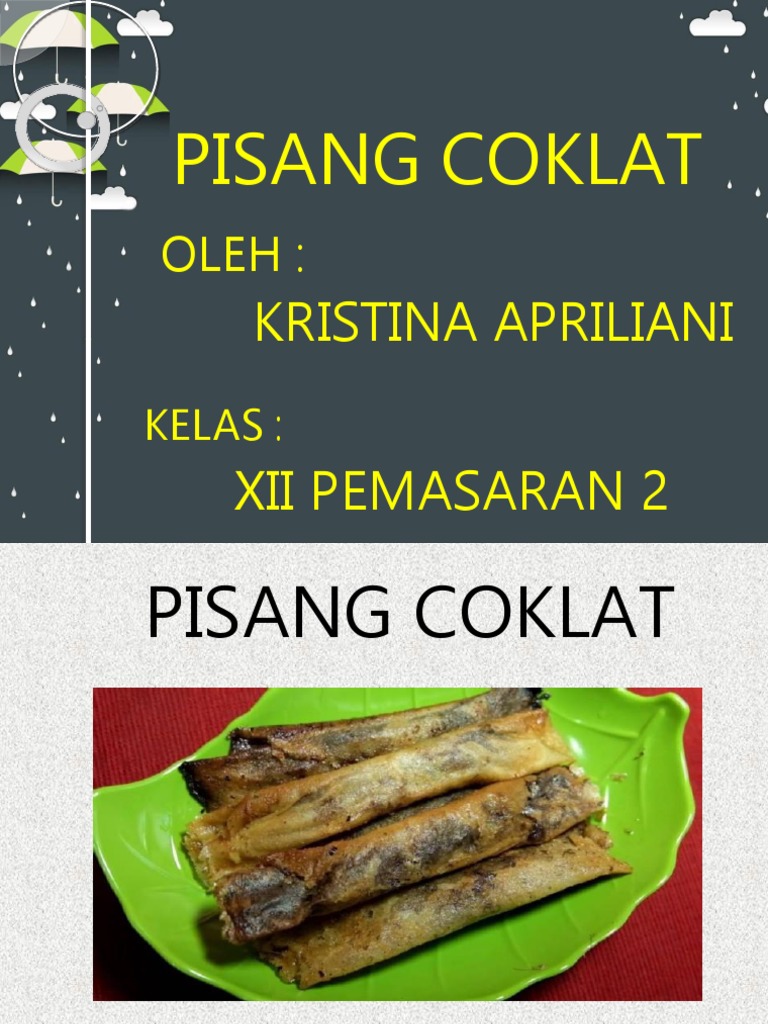 Contoh Presentasi Proposal Usaha Lumpia Bisnis Plann Sudah tahukah anda dengan makanan yang satu ini. XII PEMASARAN 1 - ppt downloadProposal. Product Produk 1Produk yang dijual adalah Pisang Coklat dan makanan ini merupakan makanan ringan yang sesuai dengan keadaan masyarakat dan Makanan selingan dalam kehidupan sehari-hari.