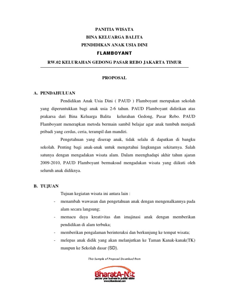 Secara umum masyarakat Desa XXX Kecamatan XXX bermata pencaharian petani sawah dan palawija keseragaman potensi mata pencaharian masyarakat menarik untuk dikembangkan pada wisata budaya. DOC Proposal wisata Teguh Satrianova - Academiaedu DOC Kunjungan industri PROPOSAL KUNJUNGAN INDUSTRI DAN WISATA SMK NEGERI 1 BRINGIN NGAWI eka nurlita - Academiaedu Proposal study tour Proposal Studi Wisata Proposal Wisata Tera Tour Solo Contoh Proposal Kegiatan Karya Wisata Taman Kanak-Kanak DOC PROPOSAL PENGEMBANGAN WISATA. Kawasan wisata alam merupakan kawasan dengan beberapa ciri khas tertentu baik di darat maupun di perairan wisata pantai merupakan salah satu jenis wisata alam yang berkaitan dengan perairan.