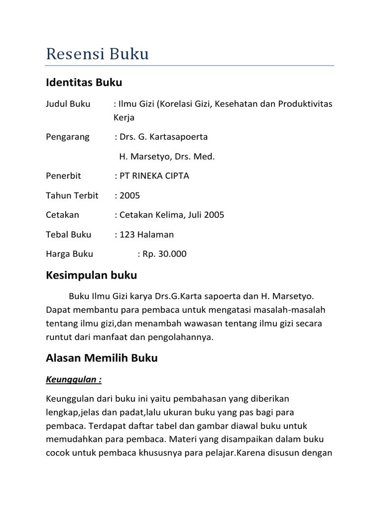 Contoh resensi buku tentang kesehatan. Berikut ini tersedia beberapa artikel yang menjelaskan secara lengkap tentang contoh resensi buku tentang kesehatan. Meski begitu dengan kerendahan hati Ade mengakui bahwa apapun yang ia tulis tak lebih sekadar dhonny atau persangkaan semata karena pemilik mutlak Qothiy kesehatan hanya Allah semata.