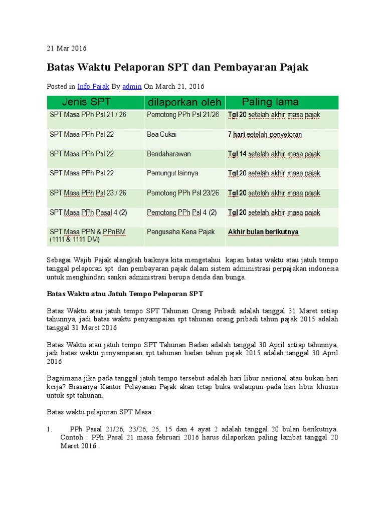 Batas Waktu Pelaporan Spt Dan Pembayaran Pajak Pajak Club