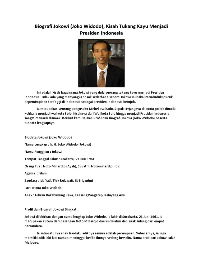 Biografi jokowi secara singkat. Ia lahir dari pasangan Widjiatno Notomihardjo dan. Joko Widodo yang lahir pada tanggal 21 Juni 1961 merupakan politikus Indonesia yang sekarang menjabat sebagai gubernur Jakarata. Sosoknya mulai terkenal ketika ia menjabat sebagai walikota Solo selama 2 kali periode berturut-turut yakni pada tahun 2005 sampai 2012.