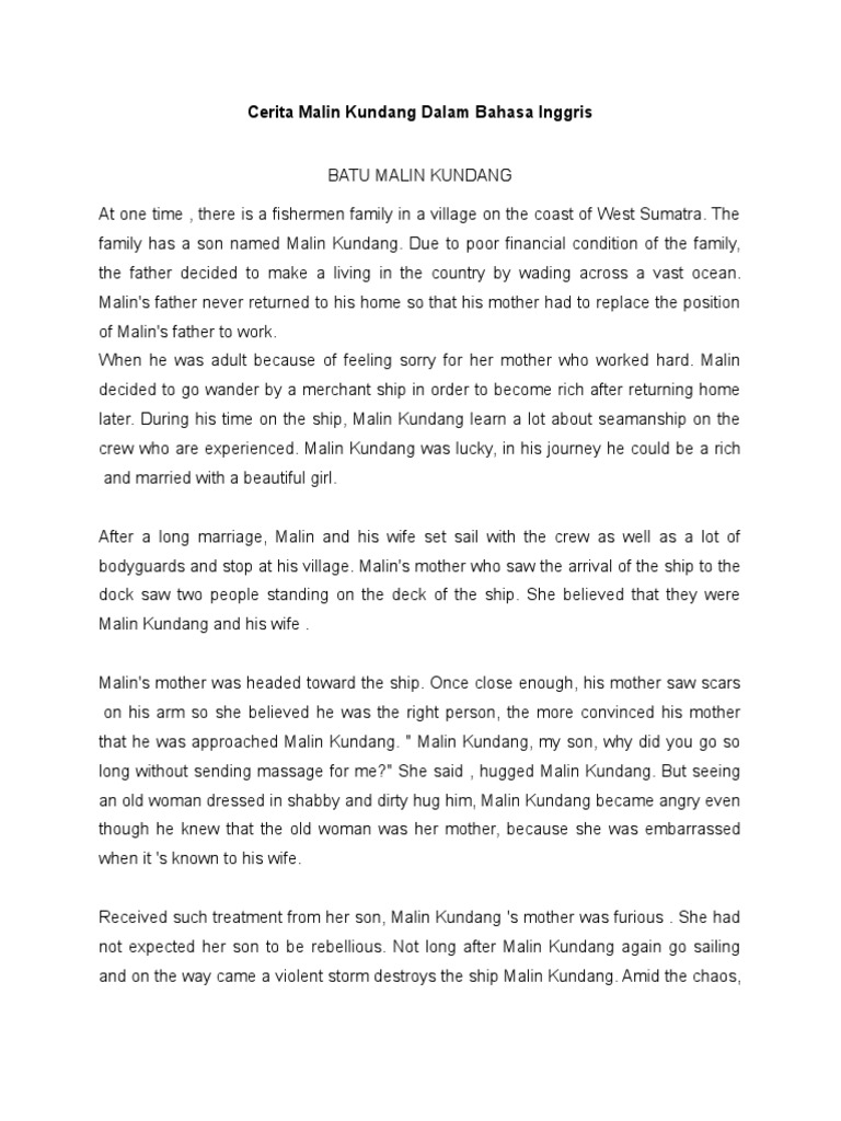Cerita malin kundang singkat pendek. Cerita malin kundang singkat indonesia. Terjemahan Cerita Malin Kundang dalam Bahasa Inggris Pada zaman dahulu kala ada sebuah keluarga miskin yang terdiri dari sorang ibu dan anak satu-satunya yang bernama Malin Kundang.