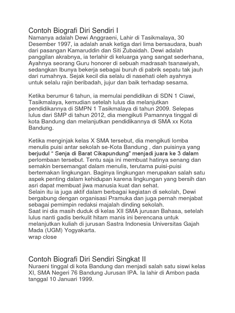 Contoh biografi singkat diri sendiri. Ia lahir tepat pada tanggal 8 Juli 1998 di Kotabaru Kecamatan Keritang. I am the second daughter of Pratikto Haryadi a teacher in Mekarsari High School and my mother Rumanah who is a house wife. Aku adalah anak kedua dari lima bersaudara dari pasangan Dimas Koswara dan Nyimas Ratuwangi.
