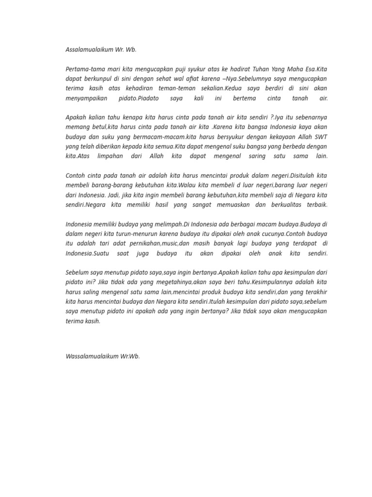 Marilah sama-sama kita meningkatkan ketakwaan kepada Allah SWT dengan melaksanakan segala suruhannya dan menjauhi segala perkara yang dilarangnya. 6 Contoh Pidato Cinta Tanah Air untuk SDSMP SMA dll. Contoh cinta pada tanah air adalah kita harus mencintai produk dalam negeriDisitulah kita membeli barang-barang kebutuhan kitaWalau kita membeli d luar negeribarang luar negeri dari Indonesia.