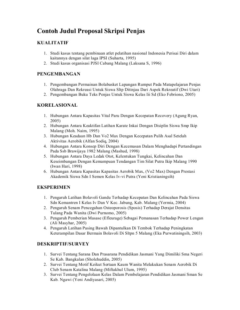 Dengan permainan gobak sodor ini peneliti akan mengembangkan teknik dasar permainan sepak bola yaitu menggiring dan mengumpan. Contoh Judul Proposal Skripsi Penjas - Hallo sahabat SKRIPSI OLAHRAGA Pada sharing Film kali ini yang berjudul Contoh Judul Proposal Skripsi Penjas saya telah menyediakan SKRIPSI OLAHRAGA Terbaru. Contoh Proposal penjaskes pdf Karena bola dimainkan tangan dengan tujuan dipukul keras ke arah lapangan lawan dari atas ke bawah melewati atas jarring yang menjadi pembatas dan sekaligus perintang maka keterampilan.