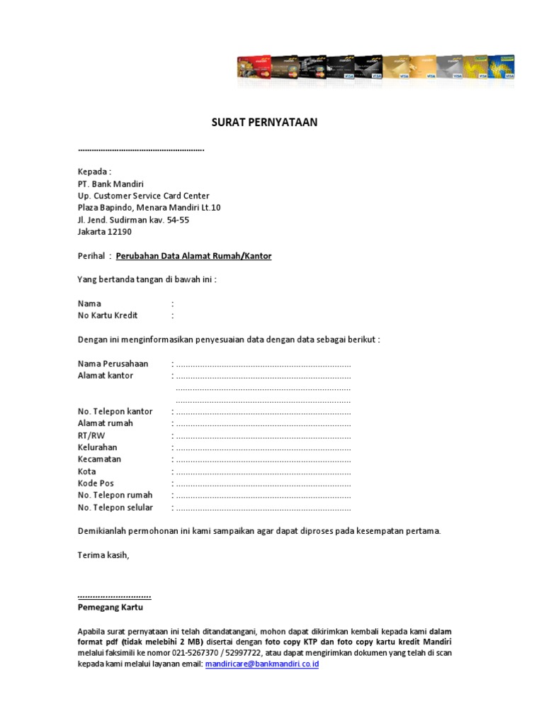 Demikian contoh surat pernyataan permintaan pergantian kartu kredit karena rusak silahkan dicopy paste dan di edit atau dirapikan. Apabila surat pernyataan ini telah ditandatangani mohon dapat dikirimkan kembali kepada kami dalam format pdf tidak melebihi 2 MB disertai dengan foto copy KTP dan foto copy kartu kredit Mandiri melalui faksimili ke nomor 021-5267370 52997722 atau. Kirimkan surat pernyataan dan dokumen pendukung lainnya ke bank anda melalui email atau.