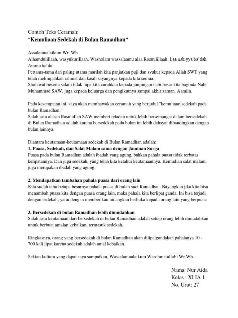 Contoh teks ceramah kultum. Beberapa contoh ceramah Ramadhan di atas bisa kamu tiru untuk mengisi kultum. Pertama-tama marilah kita panjatkan puji syukur atas kehadirat Allah SWT yang telah memberikan rahmat dan hidayah-Nya sehingga pada kesempatan ini dapat bertemu dalam keadaan sehat. Sedangkan keutamaan puasa bagi jasmani dan rohani sebagaimana dikutip dari Dahsyatnya 7 Puasa Wajib Sunnah Thibbun Nabawi Maryam Kinanthi 2017.