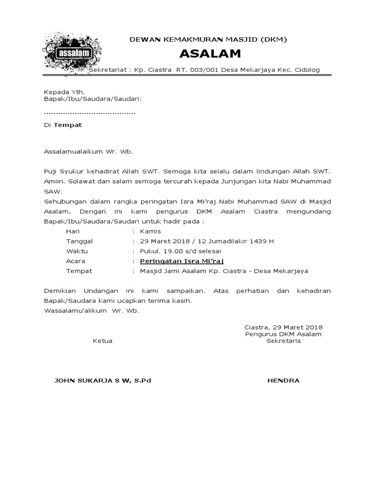 Download contoh surat undangan pembentukan pengurus Takmir Masjid Format Doc ms word bisa diunduh dan edit sesuai dengan hari tanggal tempat serta penandatanganan surat. PANITIA PEMBANGUNAN MASJID BAITUL MUTTAQIN DusunSelokambang Desa PurwosonoKec. Lengkap Contoh Surat Undangan Isra Miraj Untuk Masyarakat.