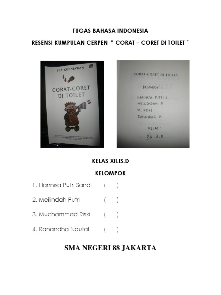 138 Sinopsis Kumpulan cerita pendek Eka Kurniawan yang terbit di masa. Corat-Coret Di Toilet Pengarang. Ada tiga belas cerpen yang disuguhkan.