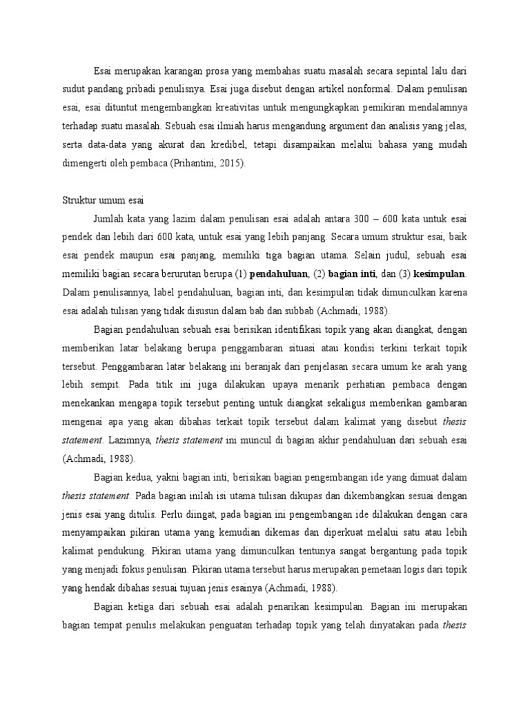 Judul Pendahuluan Pembahasan Kesimpulan dan Saran Daftar Pustaka 2. Penulisan essay sifatnya subjektif sehingga akan sangat bergantung dari sudut pandang penulisnya. Esai ditulis dalam 5001000 kata.