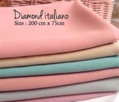 Kain diamond sendiri memiliki beberapa jenis namun yang paling banyak digunakan untuk jilbab non instan adalah jenis diamond italiano. Serat kain diamond juga tidak begitu terlihat seperti kain katun karena memang yang ditonjolkan adalah tekstur pasirnya. Pashmina Segiempat Khimar Hoodie dan lain-lain.