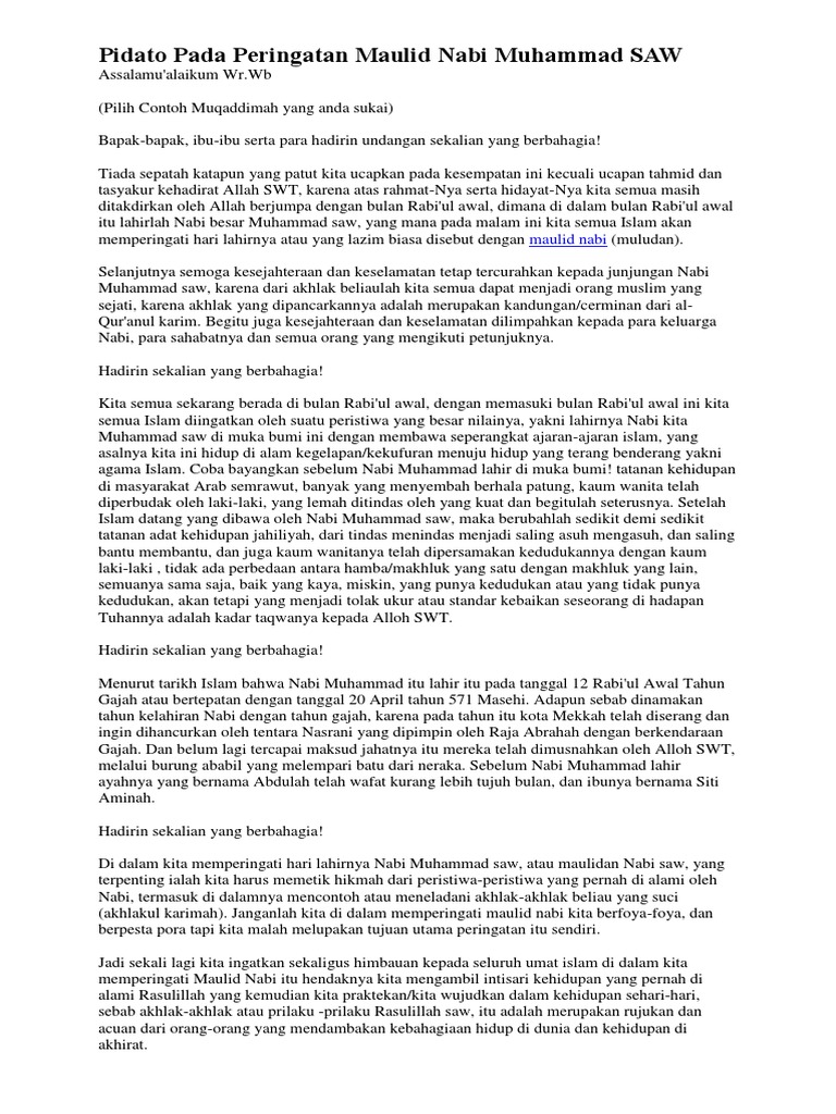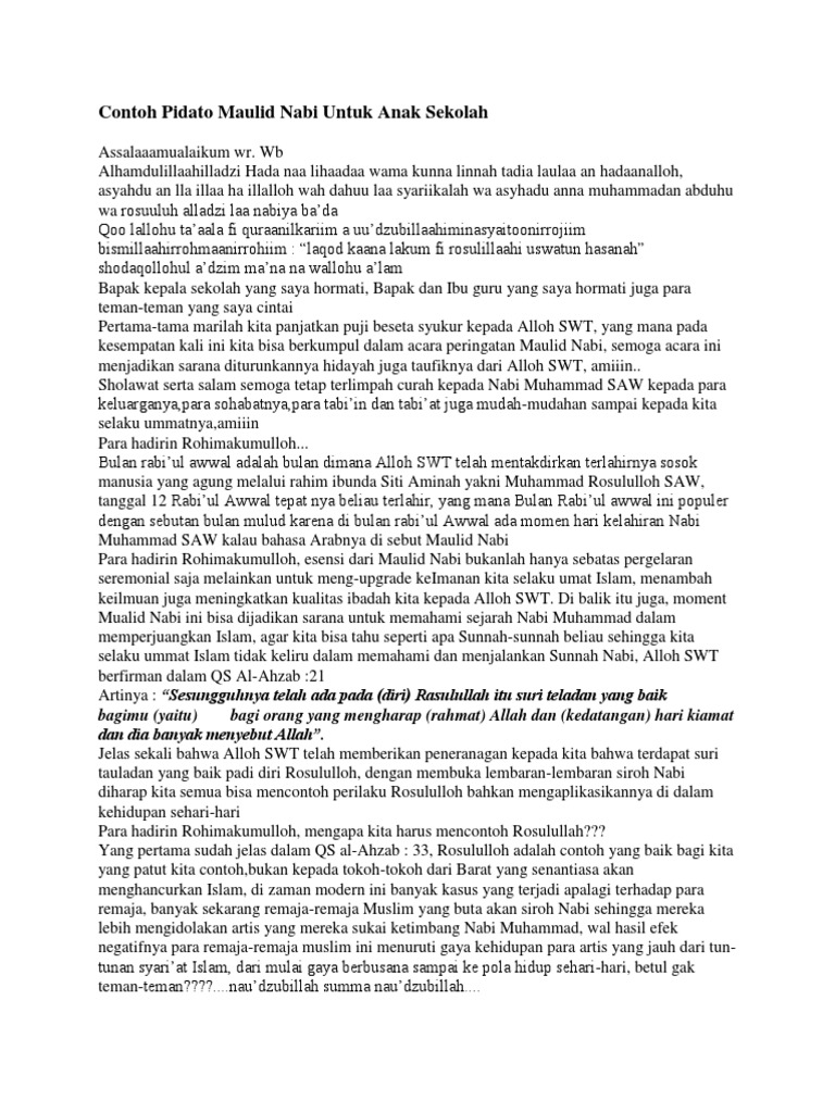 Pidato Tentang Rasulullah Nov 05 2020 DOC PIDATO SINGKAT PERINGATAN MAULID NABI MUHAMMAD SAW daurulang daur - Academiaedu Pidato Keteladanan Rasulullah SAW Beranda Ilmu. Maulid Nabi Muhammad SAW Jatuh pada 29 Oktober 2020 Ini Hukum Keutamaan Memperingati hari kelahiran Nabi Muhammad SAW setiap tanggal 12 Rabiul Awal Selasa 27 Oktober 2020 1202 WIB Tweet. Klaster Baru Kecamatan Tebet Tracing Warga yang Hadiri Maulid.