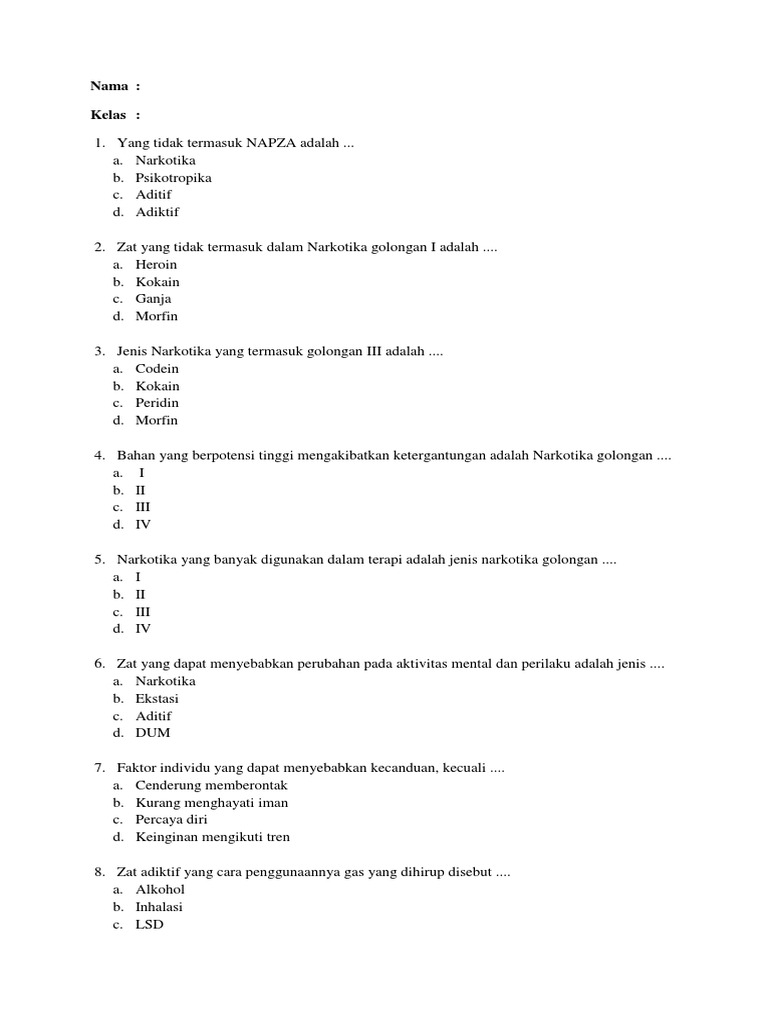 20 Soal Zat Adiktif Dan Psikotropika Pilihan Ganda Kunci Jawaban