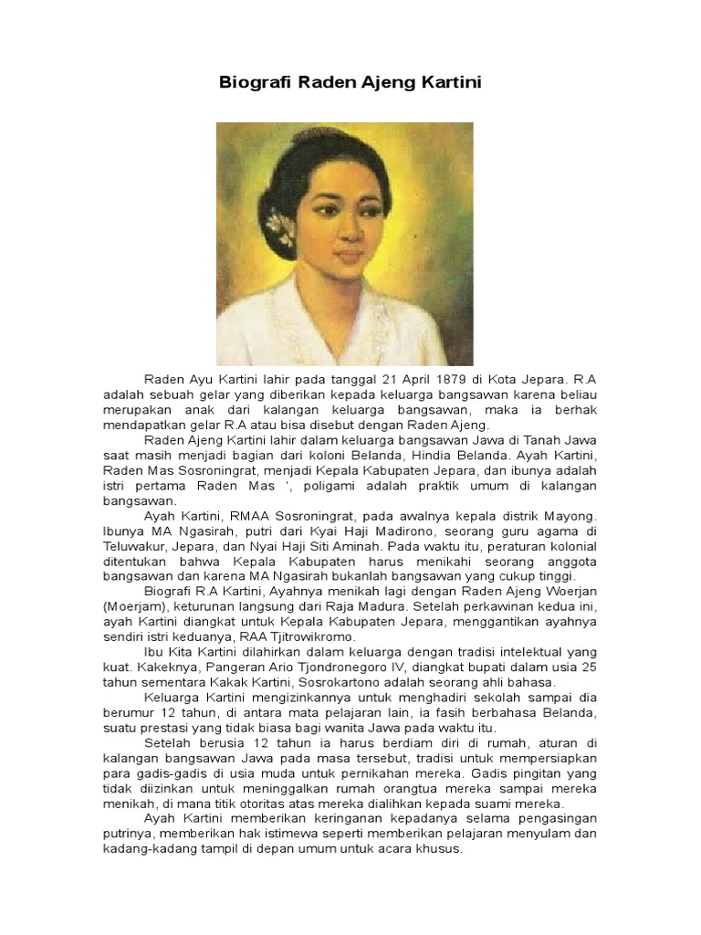 Biography RA Kartini dalam Bahasa Inggris Profile Name. Raden Adjeng Kartini or Lady Kartini born in Jepara Central Java on April 21 1879. Her father is Raden Mas Adipati Ario Sosroningrat and her mother is Ngasirah.