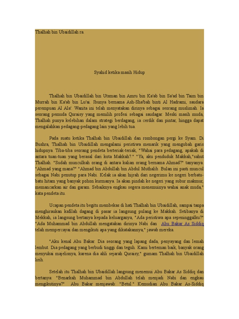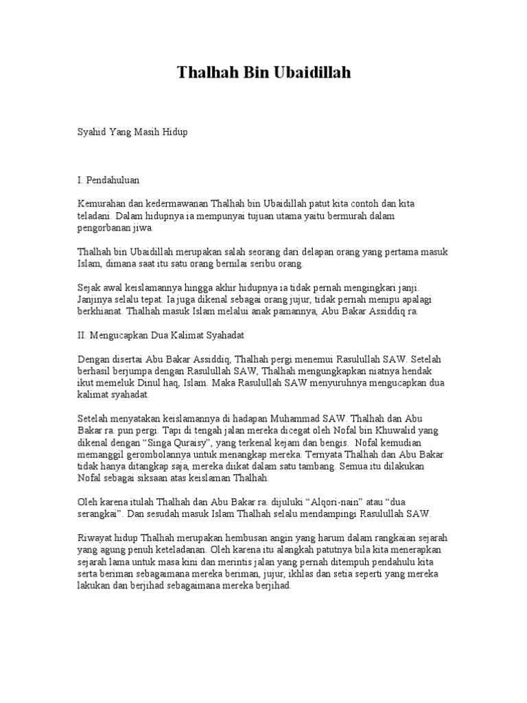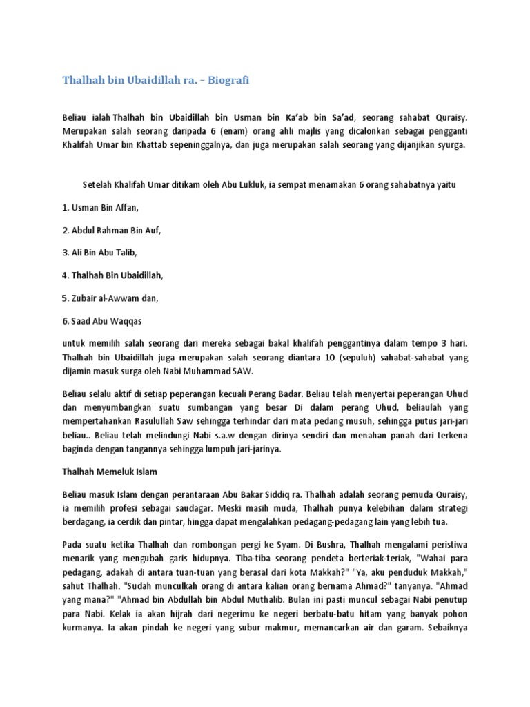 Biografi thalhah bin ubaidillah. Merupakan salah seorang daripada 6 enam orang ahli majlis yang dicalonkan sebagai pengganti Khalifah Umar bin Khattab sepeninggalnya dan juga merupakan salah seorang yang dijanjikan syurga. Thalhah mengikuti Perang Uhud dan. Kisahteladan 0 Komentar biografi thalhah bin ubaidillah burung elang hari uhud ciri-ciri fisik thalhah julukan thalhah kisah 10 sahabat nabi yang dijamin masuk syurga kisah thalhah kisah thalhah bin ubaidillah perang uhud.