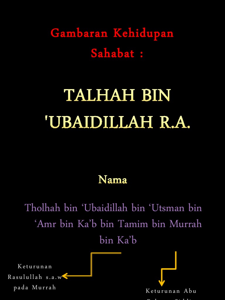 Kisah Thalhah bin Ubaidillah awal keislaman hingga wafatnya. Setelah kesyahidan Imam Husain as ia menikah dengan Abdullah bin. Nama lengkap beliau adalah Thalhah bin Abdullah bin Usman bin Kaab bin Said.