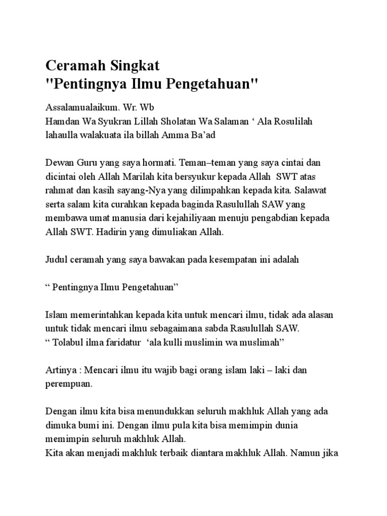 Dapatkan teks ini via WhatsApp. Ceramah Singkat Tentang Ilmu 02 Assalamualaikum. Contoh Kultum Singkat tentang Ilmu Pengetahuan Assalamualaikum Wr.