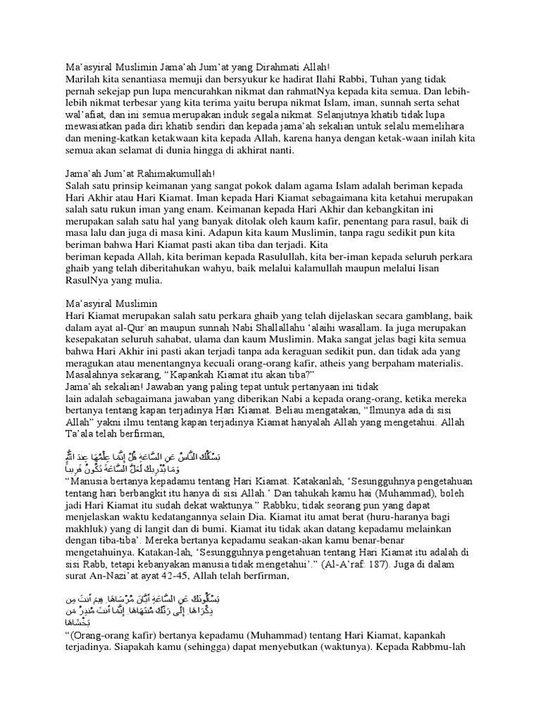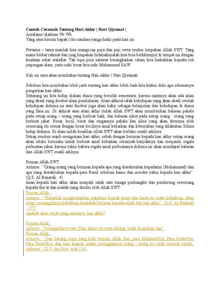 Download Contoh Teks Ceramah Singkat Tentang Hari Akhir PDF 1000 MB - SamPDF Unduh Contoh Teks Ceramah Singkat Tentang Hari Akhir PDF secara gratis di SamPDF. Iman kepada hari akhir adalah rukun iman yang. 187 Juga di dalam surat An-Naziat ayat 42-45 Allah telah berfirman.