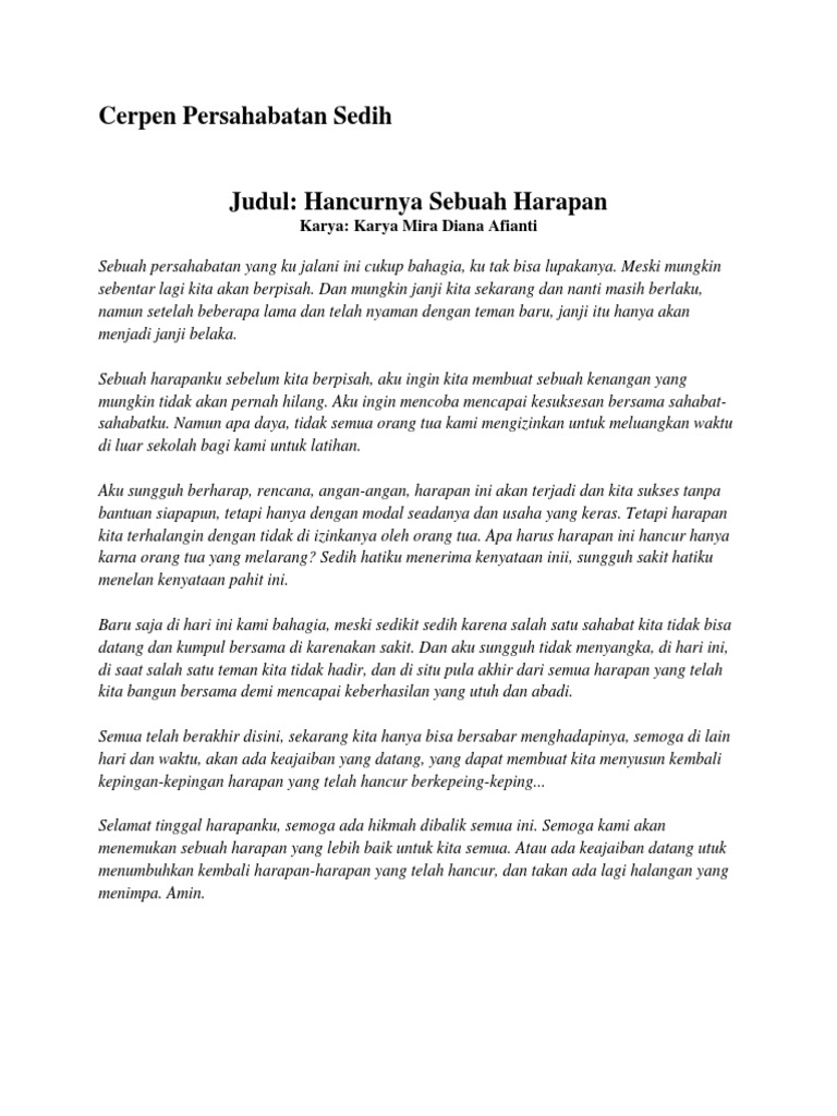 Arum Nadia Hafifi Cinta itu memang kadang membuat orang lupa akan segalanya. Cerpen Kamis 09 Mei 2013 Persahabatan yang Hancur selama 1 tahun setengah kita bersama-sama ketawa bareng bercanda bareng kemana-mana kita bareng kekantin bareng kecuali kekamar mandi kita ga bareng-bareng. Demikianlah cerpen persahabatan hancur karena cinta yang menyentuh hati semuanya bisa hilang dan hancur dalam sekejap mata.