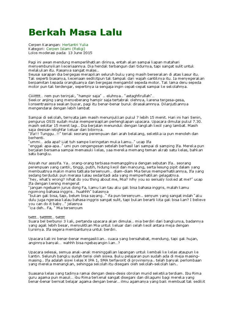 Cerpen Islami 2017 - Setelah kita kemaren Posting Kumpulan Cerpen Persahabatan Kali ini kita akan share Kumpulan Cerpen Islami Terbaik Cerita pendek atau sering disingkat sebagai Cerpen adalah suatu bentuk prosa naratif fiktif. 24 January 2018 Dia penolong tahu apa yang sedang kita alami dan dia mengasihi kita semua Setamatnya dari SMA Charly meninggalkan desa tempat kelahirannya dan mencoba mengadu nasib di kota.