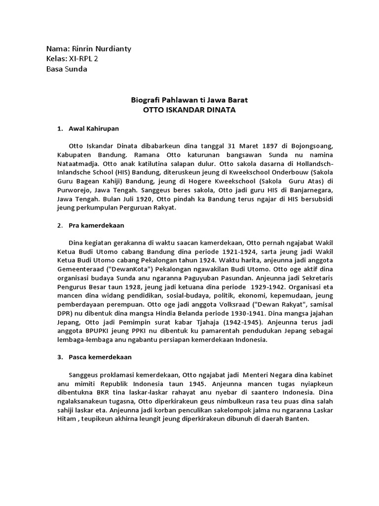 Aku lahir di keluarga yang sederhana ayahku seorang petani bernama haris. Biografi pahlawan dari jawa barat otto iskandar. 10 Contoh Biografi Bahasa Sunda Pahlawan Tokoh Terkenal Dll Kembali lagi sebuah contoh dari biografi bahasa sunda yang merupakan salah satu contoh biodata atau biografi pahlawan jawa barat dalam bahasa sunda tentang.