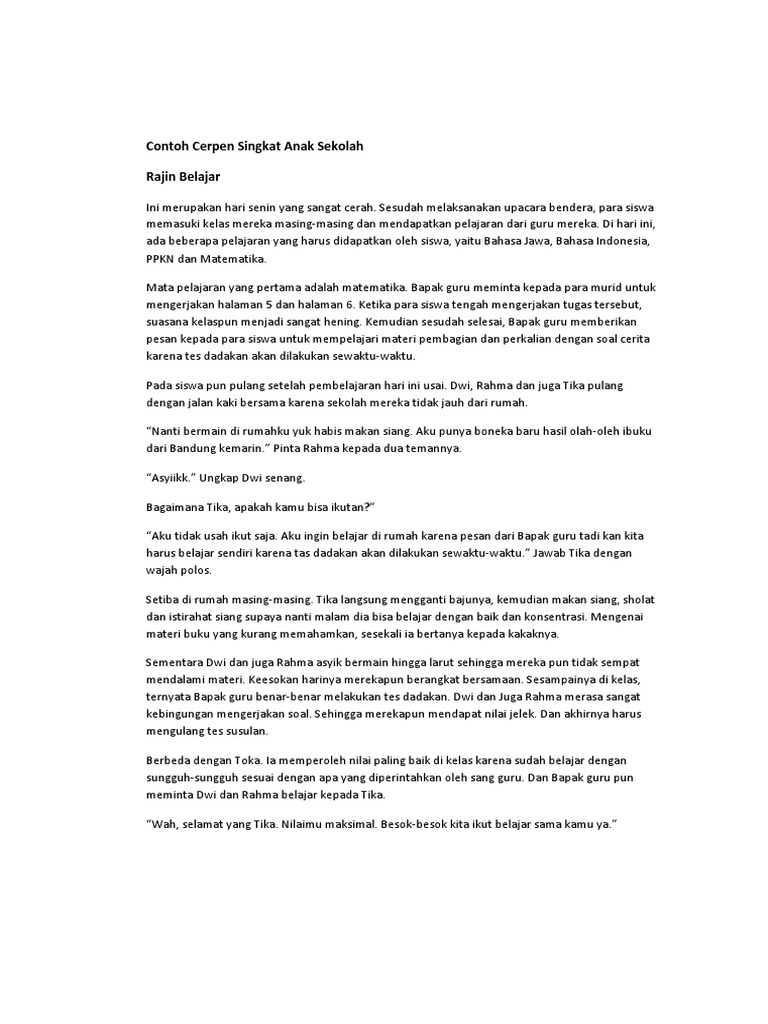 Ada banyak contoh cerpen singkat tetapi yang memberikan cerita menarik tentu tidak semuanya. Hilangnya Permaisuri Alkisah terdapat sebuah kerajaan bernama Kerajaan Aeneas. Cerpen Anak Sekolahan.