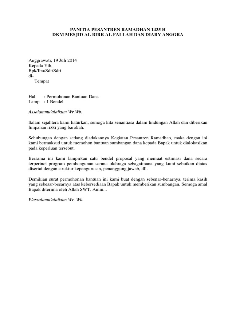 Surat Permohonan Bantuan Dana. Tandai sebagai konten tidak pantas. Kata Pengantar Puji syukur kami panjatkat kehadirat Tuhan Yang Maha Esa yang telah memberikan karunia nikmat dan kesehatan sehingga kami bisa menyelesaikan proposal usaha yang.