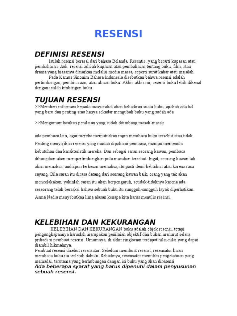 Buku ini dijadikan sebagai pedoman untuk meningkatkan kepribadian penguasaan ilmu tertentu peningkatan keimanan budi pekerti dan lain sebagainya. Resensi merupakan sebuah tulisan yang berisi tentang penilaian sebuah karya bisa berupa buku ataupun film.