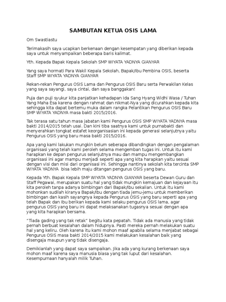 Kata sambutan ketua himpunan baru terakhir saya selaku ketua osis lama memohon maaf kepada segenap hadirin atas kesalahan baik berupa ucapan. Contoh Pidato Visi dan Misi Calon Ketua Osis Pidato adalah suatu kegiatan menyampaikan gagasan ide dan pendapat kepada khalayak umum. Kumpulan Contoh Pidato - Pidato adalah sebuah kegiatan berbicara di depan umum atau berorasi untuk menyatakan pendapatnya atau memberikan gambaran tentang suatu hal.