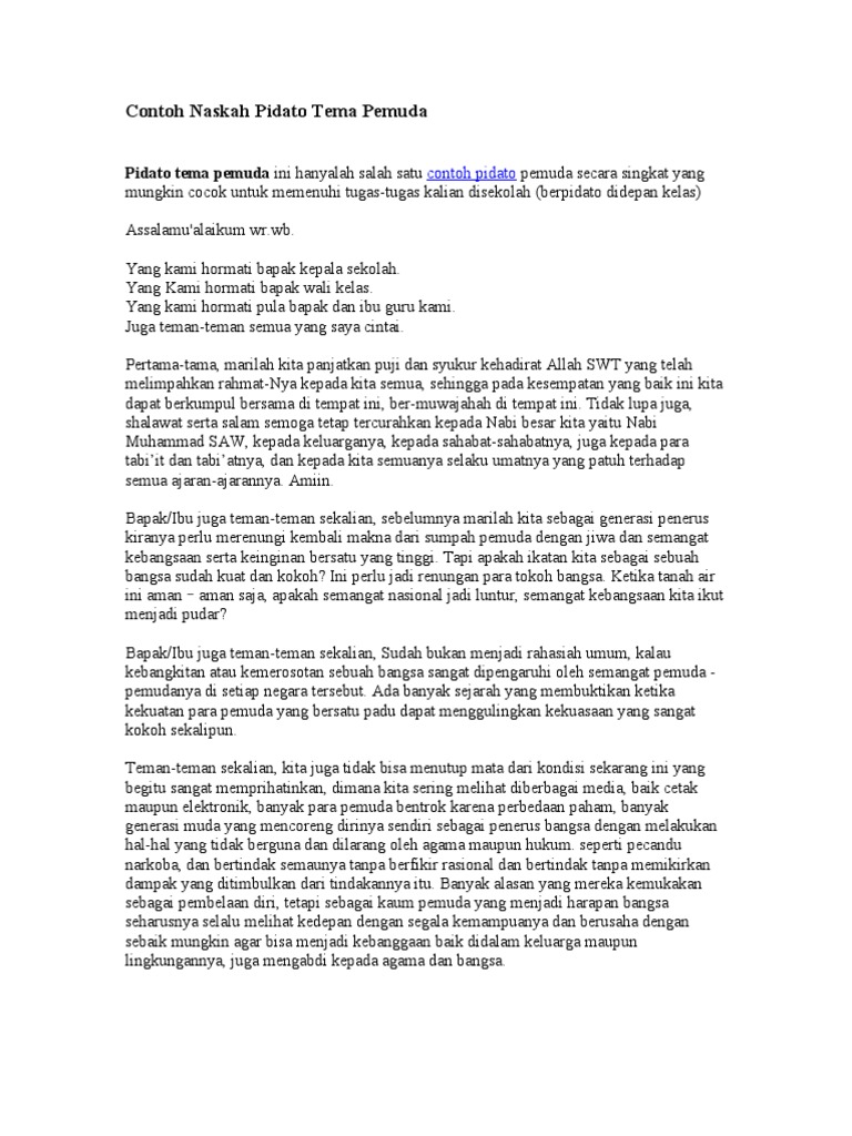 Contoh Naskah Pidato Tema Pemuda Assalamualaikum wrwb. Serta teman-teman yang saya cintai. Semoga dengan contok teks tadi bisa anda jadikan referensi untuk membuat teks pidato sendiri.