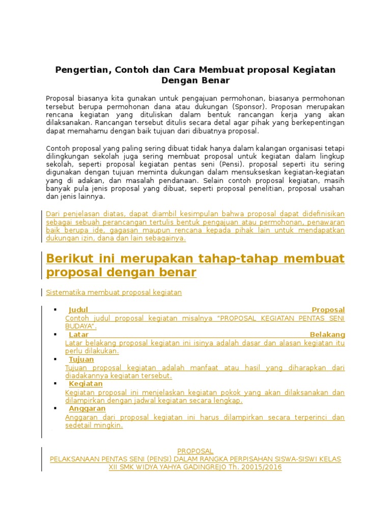 Berikut ini ada sebuah contoh proposal pelaksanaan pensi pentas seni sekolah yang bisa menjadi acuan dan referensi untuk kamu yang ingin membuat proposal sejenis sebelum melaksanakan kegiatan pentas seni di sekolah masing-masing. Waktu dan Tempat Kegiatan. Contoh Proposal Kegiatan Sekolah Jika kamu ingin membuat suatu kegiatan maka kamu harus membuat proposal.