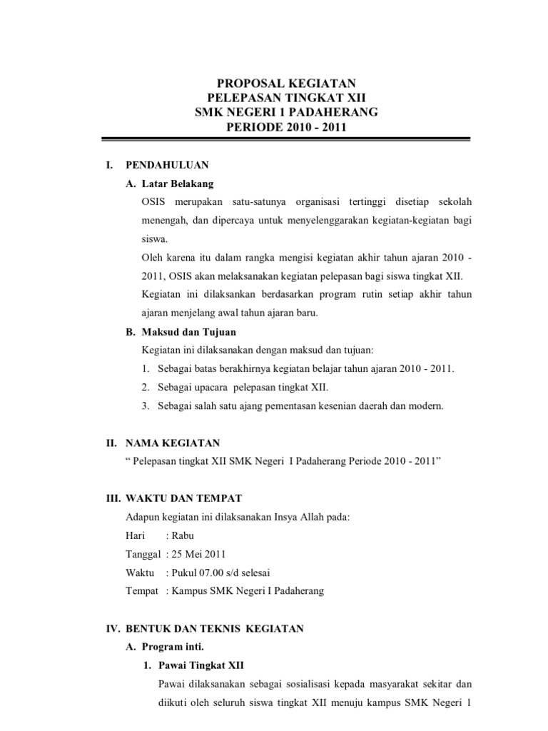 PROPOSAL KEGIATAN PERPISAHAN XII 2010-2011 DOC PANITIA KEGIATAN PERPISAHAN KELAS XII SMA NEGERI 1 LINGGA TAHUN 20152016 PROPOSAL. Contoh Proposal Kegiatan Dalam sebuah kegiatan di sebuah organisasi harus membuat yang namanya proposal. 022-6643661 Cimahi 40512 Di Susun Oleh.