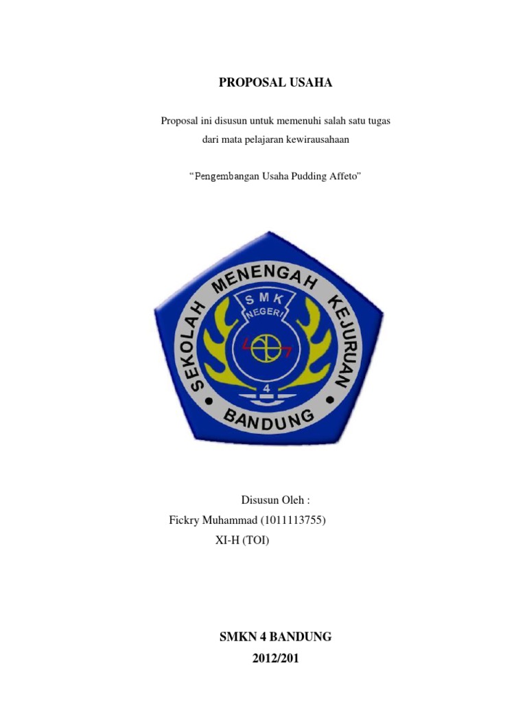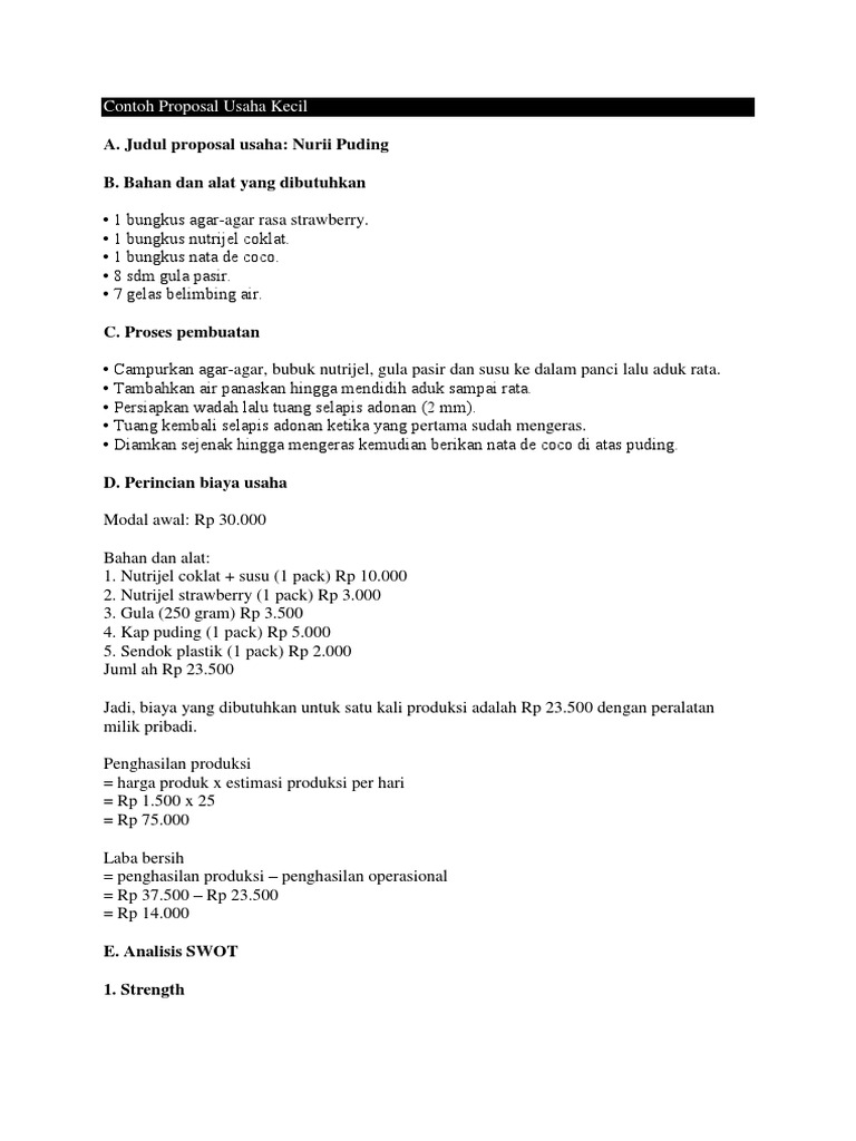 12 Tujuan Tujuan proposal ini adalah membuat sebuah produk yang dapat dinikmati tanpa harus mengeluarkan biaya yang mahal yaitu puding yang dapat di buat sendiri dirumah dan bahan- bahan. Contoh Proposal Usaha Kecil A. Contoh Proposal Usaha Langkah terbaik yang harus Anda lakukan sebelum memulai sebuah bisnis adalah menyusun perencanaan yang matang dengan membuat proposal usaha.